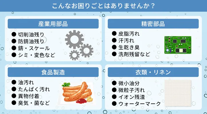 机上の仕様だけでは判断しづらい場合に備え、当社ではサンプル提供にも対応します。現場の洗浄機・対象製品・運用条件に合わせて水質を調整したサンプルを用意し、洗浄性、再汚染、乾燥後のシミ、腐食・変色、臭気、排水負荷など、貴社が重視する観点で確認いただけます。少量の評価用途から量産立ち上げ時の暫定供給、継続供給まで柔軟に対応可能です。まずは「困っている点」と「求める状態」をお聞かせください。