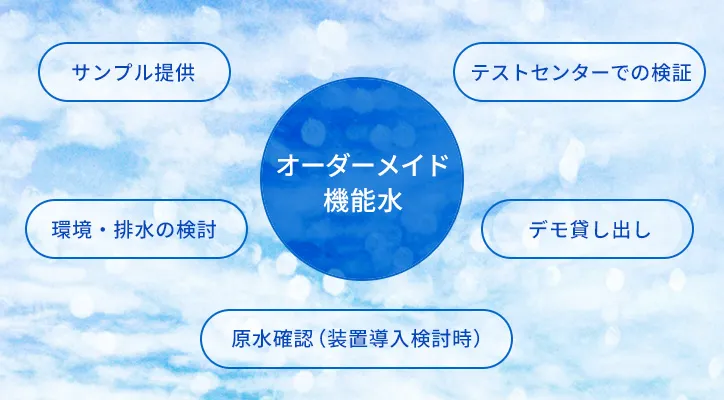 当社のオーダーメイド機能水導入にあたっては、お客様の懸念をしっかりと解消し、納得感をもってご採用いただけるよう、実機試験と評価体制によるサポートを行っています。
