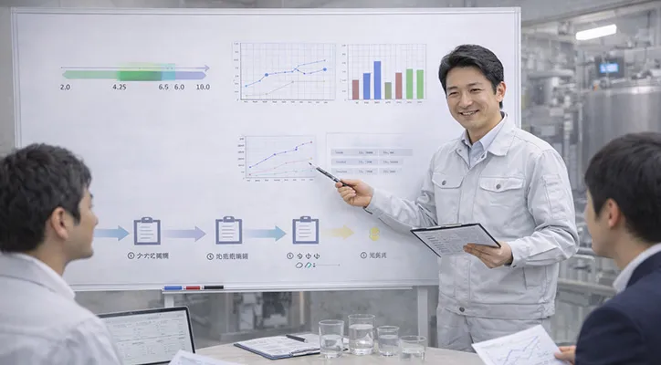 ご提案した機能水が、課題解決につながるかを確認するため、評価結果をお伺いします。洗浄性、腐敗のしにくさ、設備との相性などを踏まえ、必要に応じて当社で調整可能な範囲で、pH・電気伝導度・純度・添加条件などの条件を見直した再提案を行います。ご要望に応じて、条件を変えた再試作にも対応します。