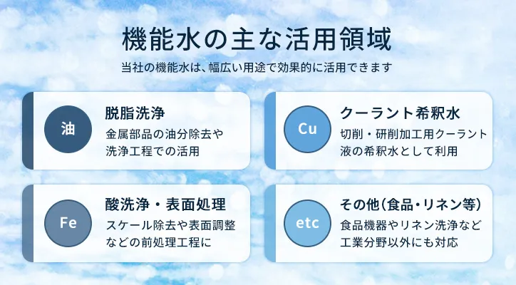 高橋金属のオーダーメイド機能水は、1993年の開発開始以来、研究開発で培ったノウハウを活かし、さまざまな現場で水販売として採用されています。自動車部品、精密機械部品、電子部品などの工業分野に加え、食品関連設備の洗浄や、衣類・リネン分野の洗浄補助など、用途に応じた導入も進んでいます。金属部品の脱脂洗浄、切削・研削加工のクーラント希釈、研究開発・評価用の試験水といった用途で提供してきました。従来の洗浄液や水処理では条件が合いにくいケースでも、水質を用途に合わせて設計することで、洗浄品質と扱いやすさの両立を目指せる点が評価されています。「まずは水で試す」選択肢として、多くの現場で検討が進めやすい導入方法です。